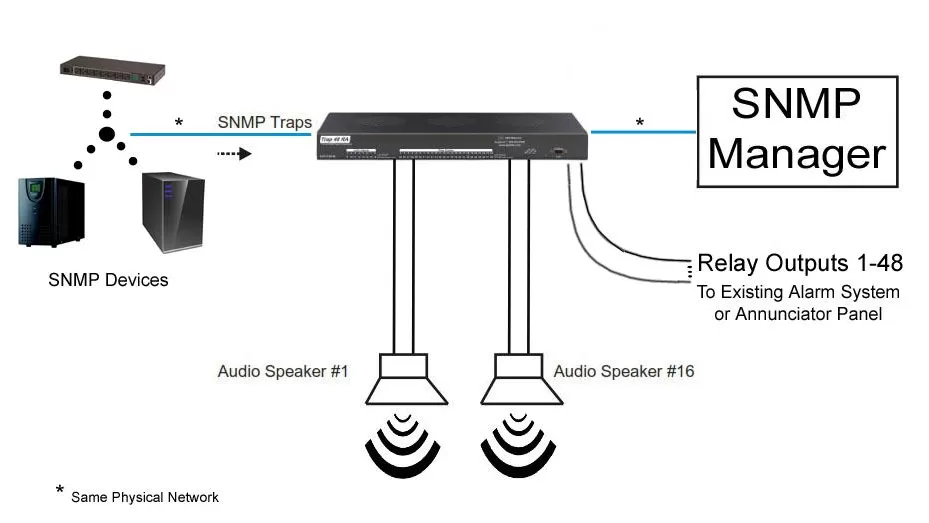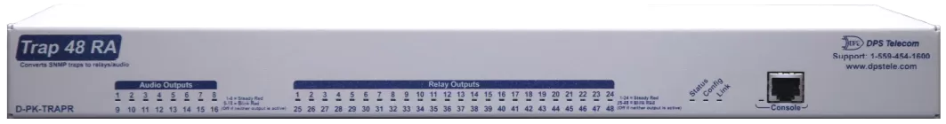 The Trap 48 RA is a device that operates up to 48 relays and 16 audio outputs using received SNMP trap information. The user can configure each relay to operate or release based on the enterprise, generic-trap, and specific-trap information of an SNMPv1 trap or the trap OID of an SNMPv2c trap. Each SNMP trap can also be defined by an optional variable binding.